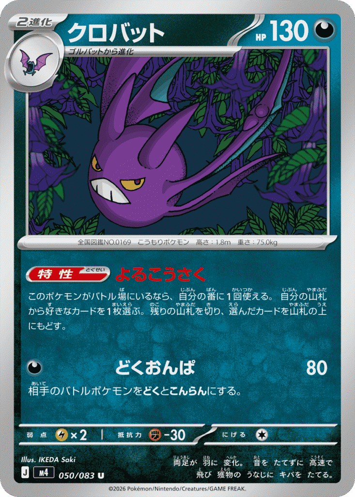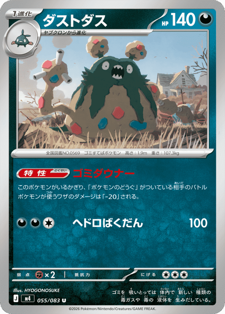 このポケモンがバトル場にいるかぎり、相手のどくのポケモンは、どくでのせるダメカンの数が5個多くなる。