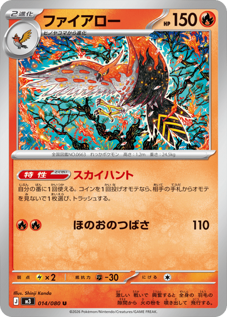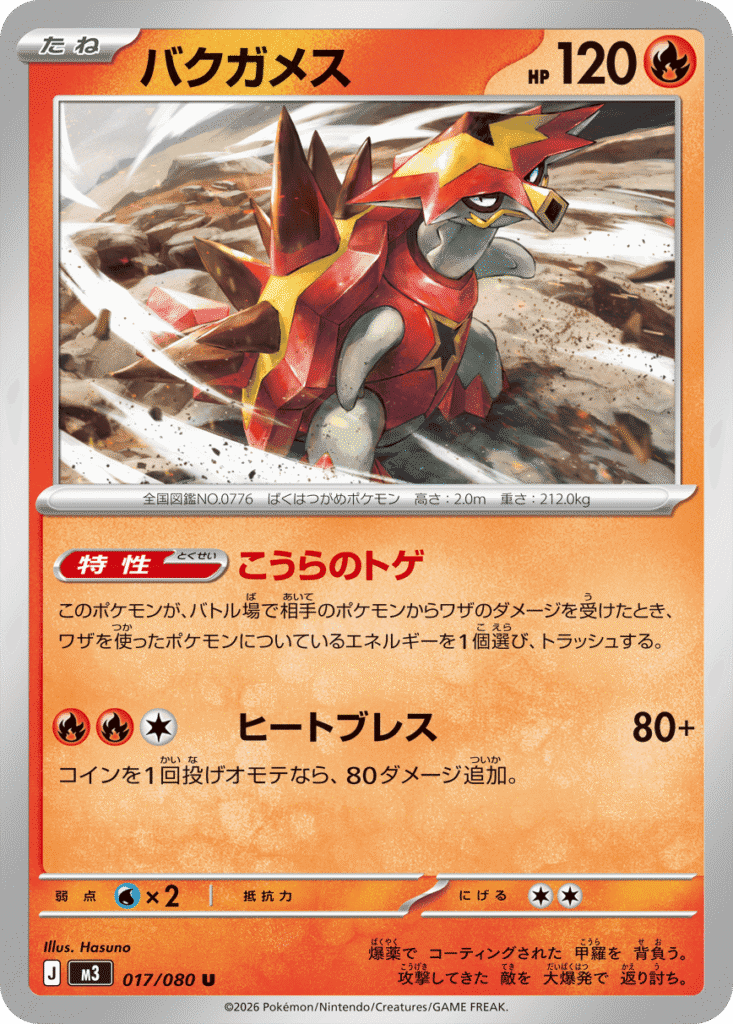 自分の番に、自分の手札から「基本ほのおエネルギー」を1枚トラッシュするなら、1回使える。相手のバトルポケモンをやけどにする。