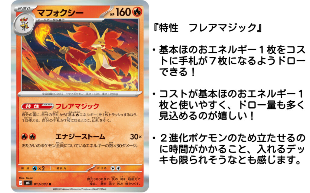 必要なコストが基本ほのおエネルギー1枚と少なく、一方で手札が7枚になるようにドローできるため、特性を使う前に手札を減らすことで大量にドローすることができるのが嬉しいポイントです(*^^*)