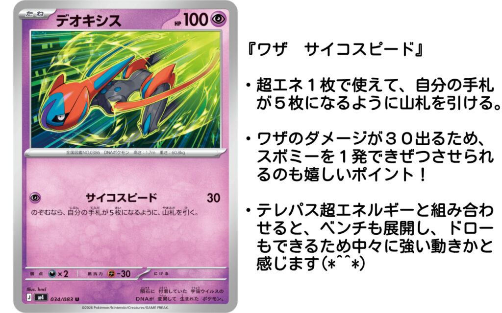 1エネでワザを使え、30ダメージ出るのでスボミーちゃんも1発できぜつさせることができるところも偉く、テレパス超エネルギーと組み合わせるとベンチも展開できてドローもできるという相当に強い動きができるよなぁと感じます(*^^*)