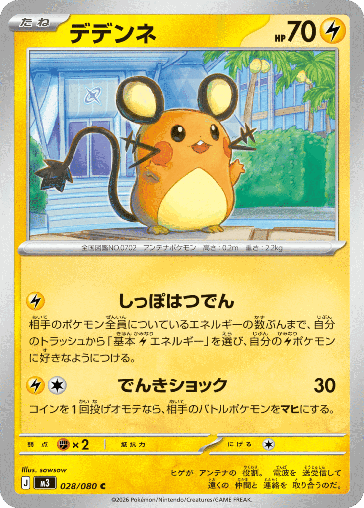 自分の番に1回使えて、使ったなら、このポケモンをきぜつさせる。自分のトラッシュから基本エネルギーを3枚まで選び、自分のかみなりポケモンに好きなようにつける。